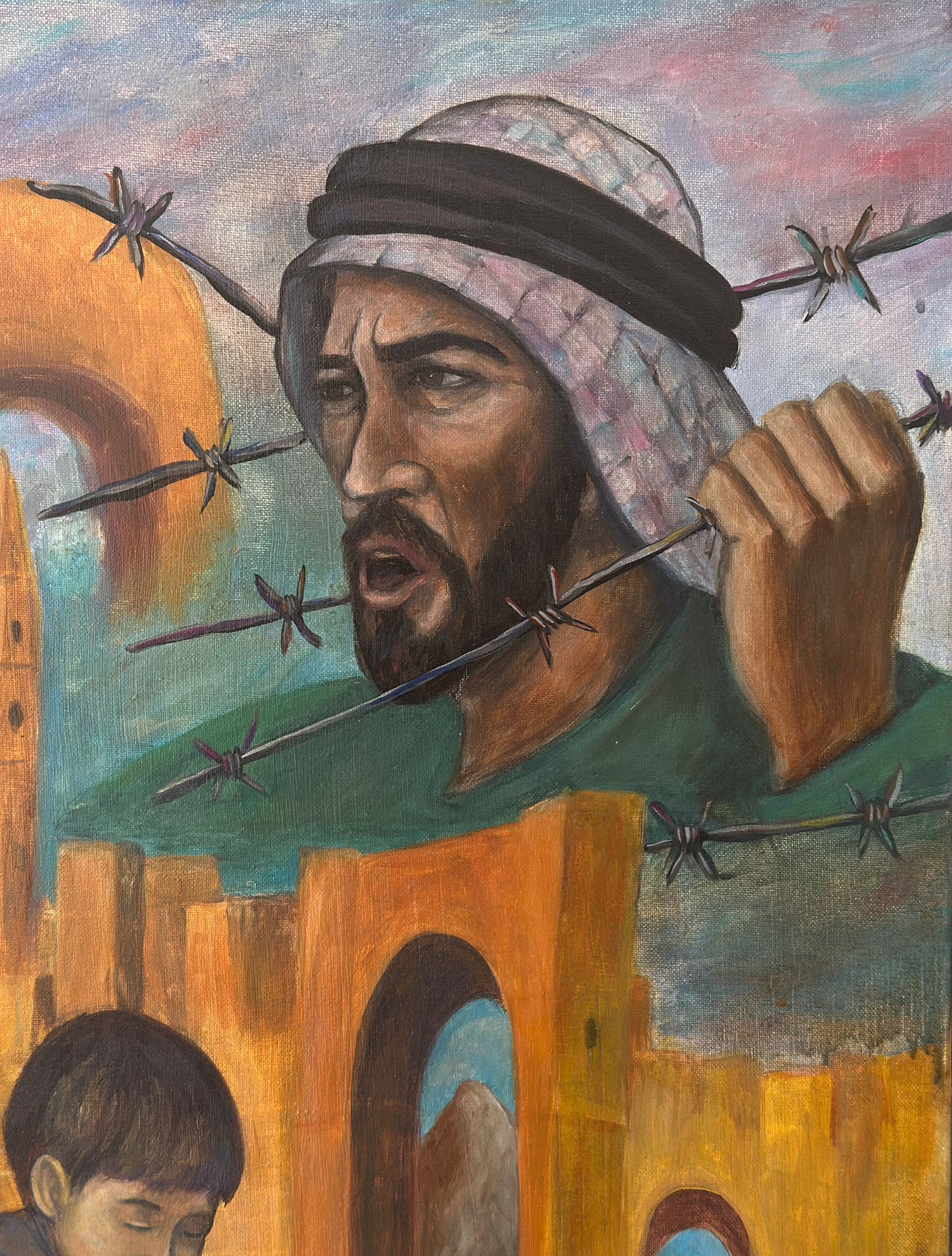 Ein Mann ruft, doch Stacheldraht schneidet seine Stimme,